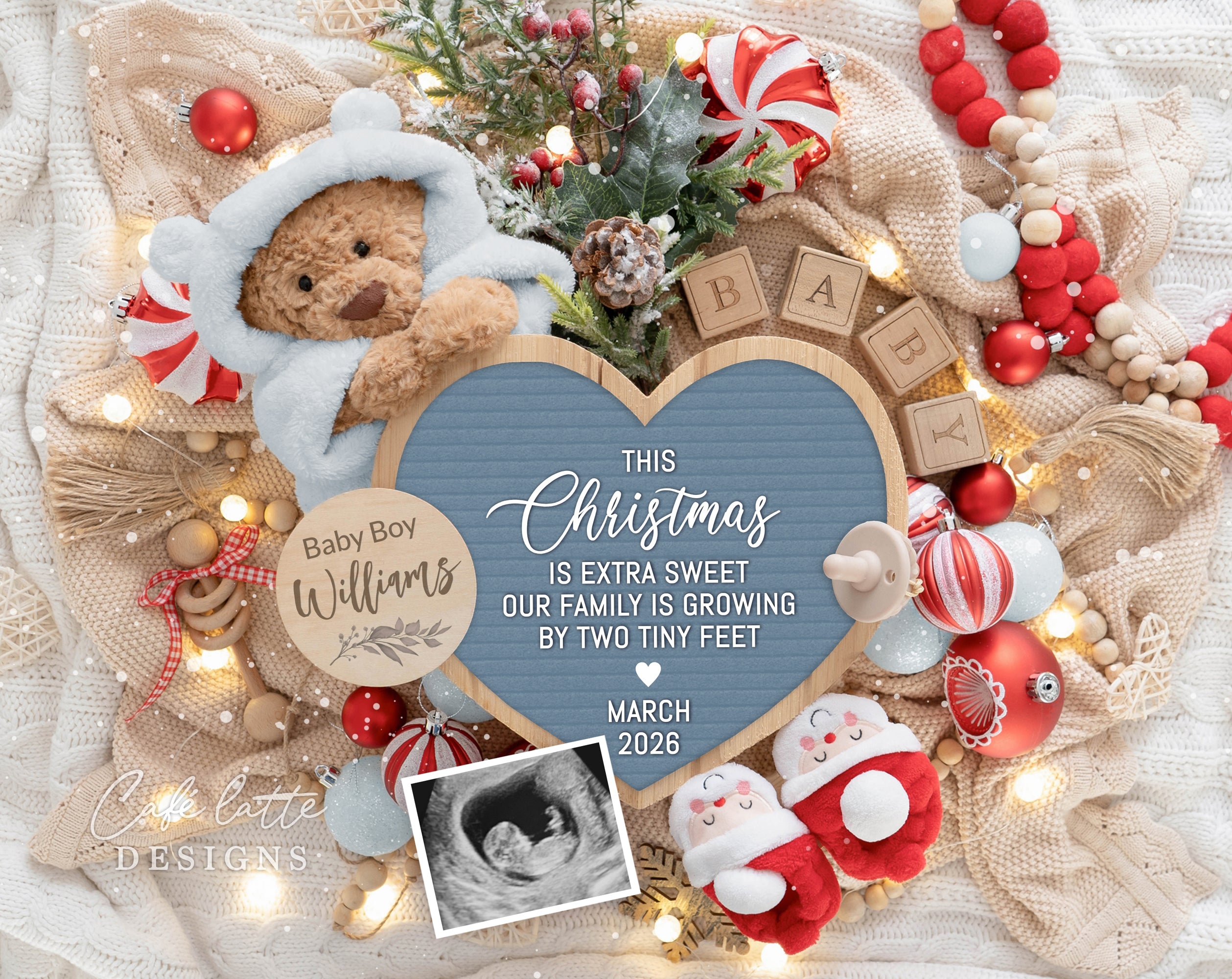 This cozy winter-themed pregnancy announcement features an adorable teddy bear wearing a blue hoody, surrounded by Christmas baby props and a blue heart letter board with the festive wording: