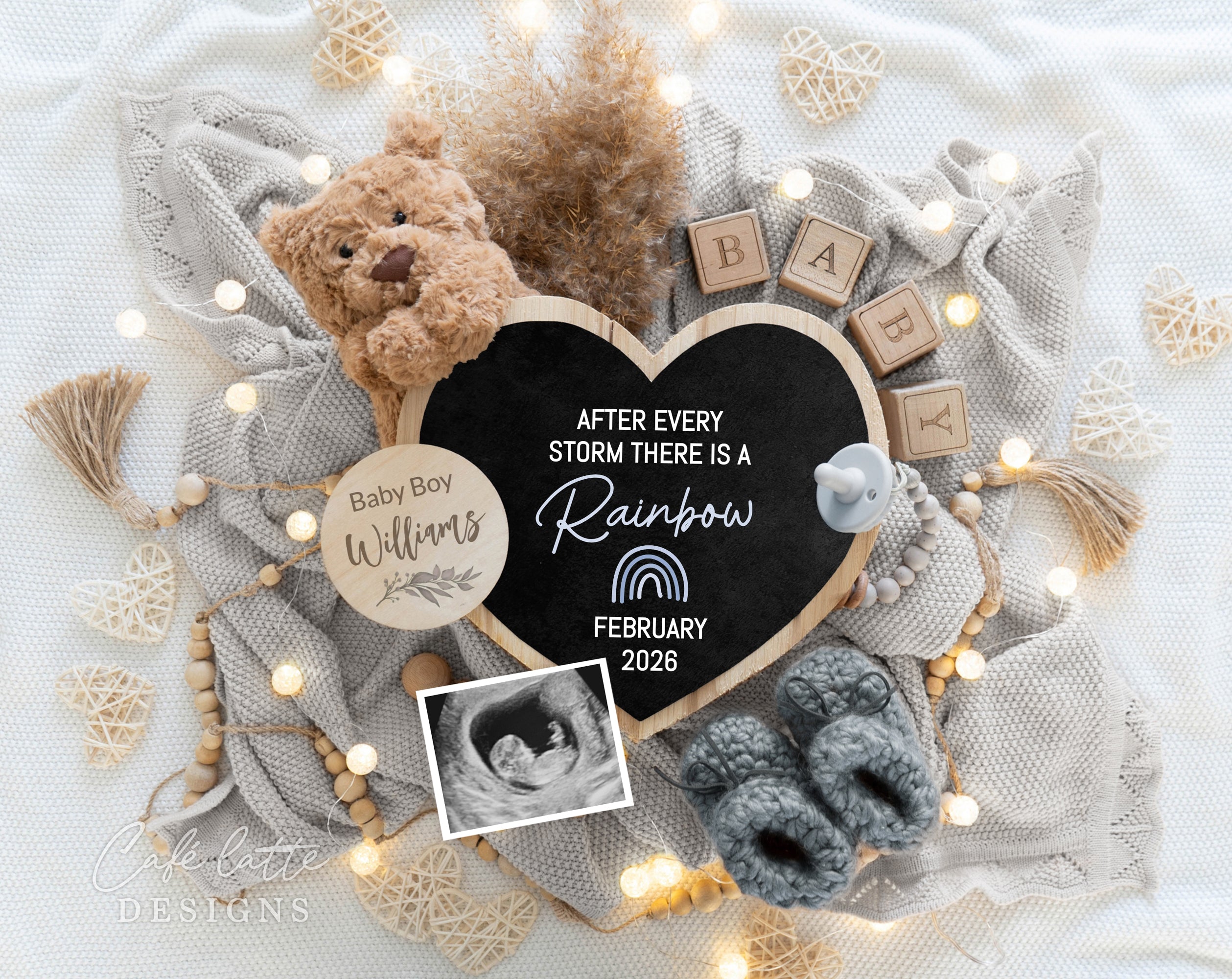 Rainbow baby boy gender reveal boho pregnancy announcement for social media that is editable and printable. Its a boy styled photograph with heart chalkboard, teddy bear, lights and blue baby props, including your baby's family name, your due date and a photo of your choice (optional). The chalkboard reads "After every storm there is a rainbow." Personalize this announcement and send it by email, through social media, text message or print it out. Perfect to announce your baby's gender to your husband, parents, sister, brother, family members and friends! You can edit the text and customize this template using Corjl.