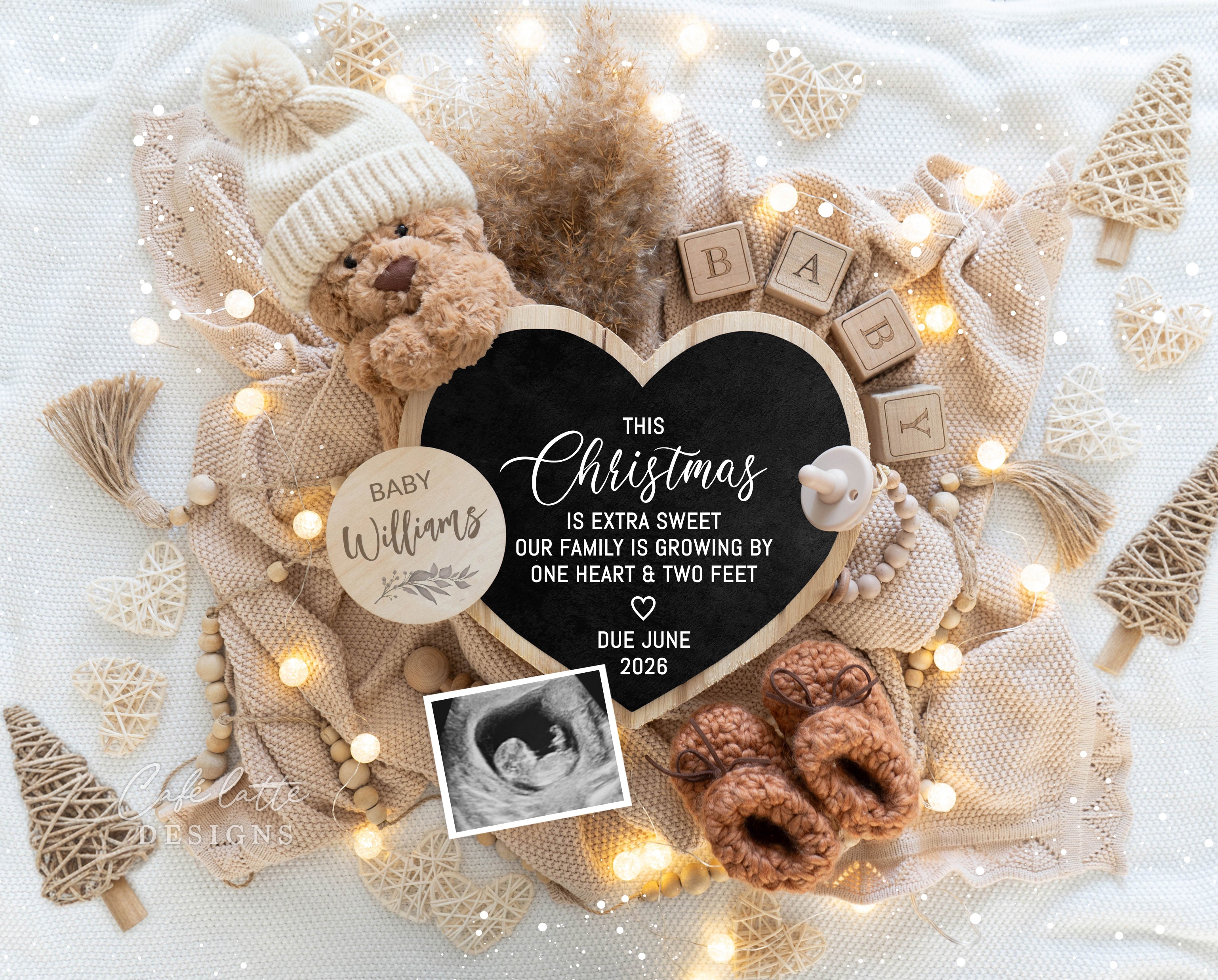Christmas gender neutral heart chalkboard boho pregnancy announcement for social media that is editable and printable. Winter styled photograph with bear wearing knitted hat, baby booties, boho Christmas trees, lights, heart chalkboard and baby props including your baby's family name, your due date and a photo of your choice (optional). Personalize this announcement and send it by email, through social media, text message or print it out. Perfect to announce your pregnancy to your husband, parents, sister, brother, family members and friends! You can edit the text and customize this template using Corjl.