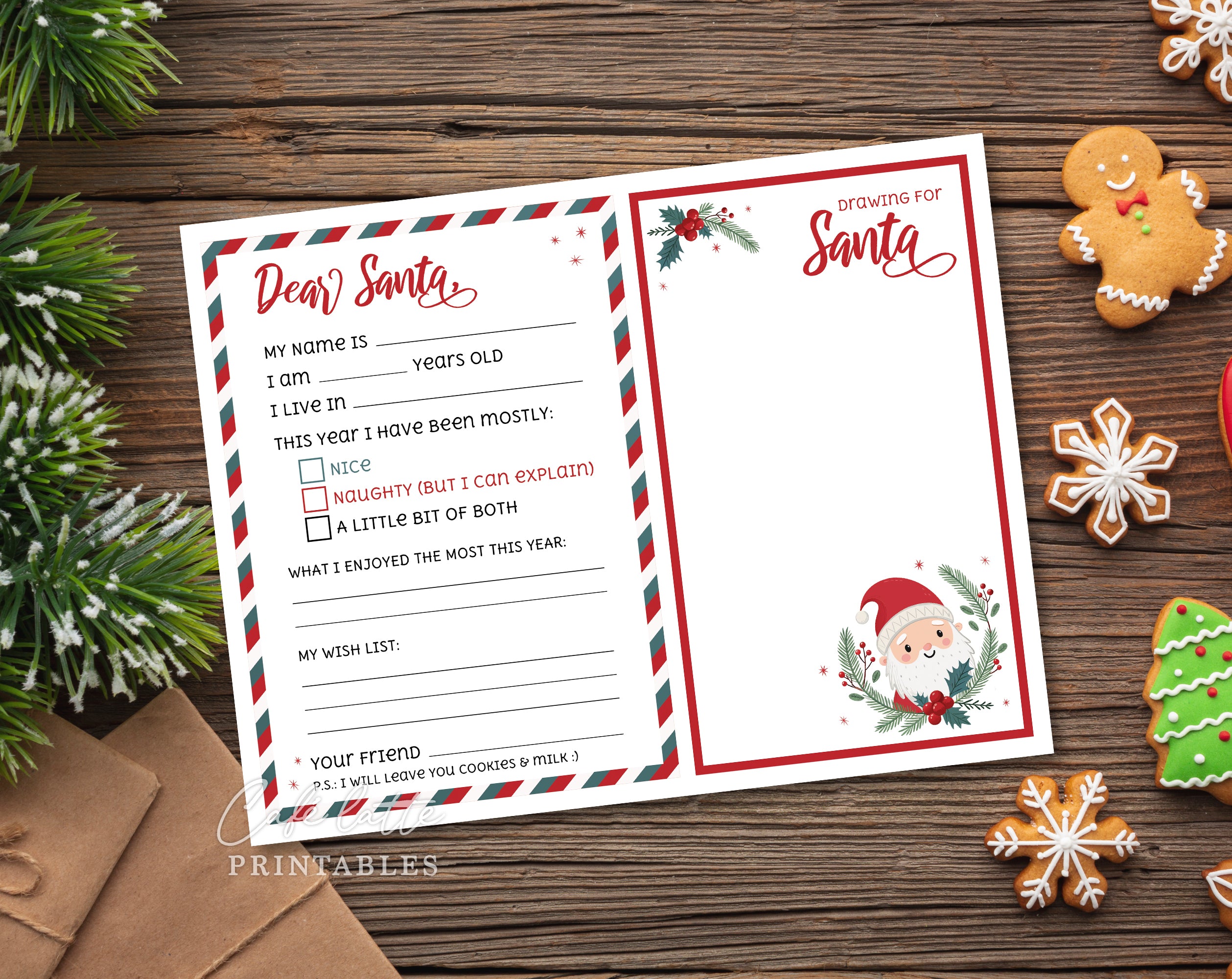 Christmas letter to Santa printable, Christmas drawing for Santa from kids printable digital instant download, Red green white stripes Christmas letter mailed to Santa, Last minute Christmas letter for Santa Claus from toddler baby, School printable for teachers Christmas fun drawing DIY, Naughty or nice wish list for Santa