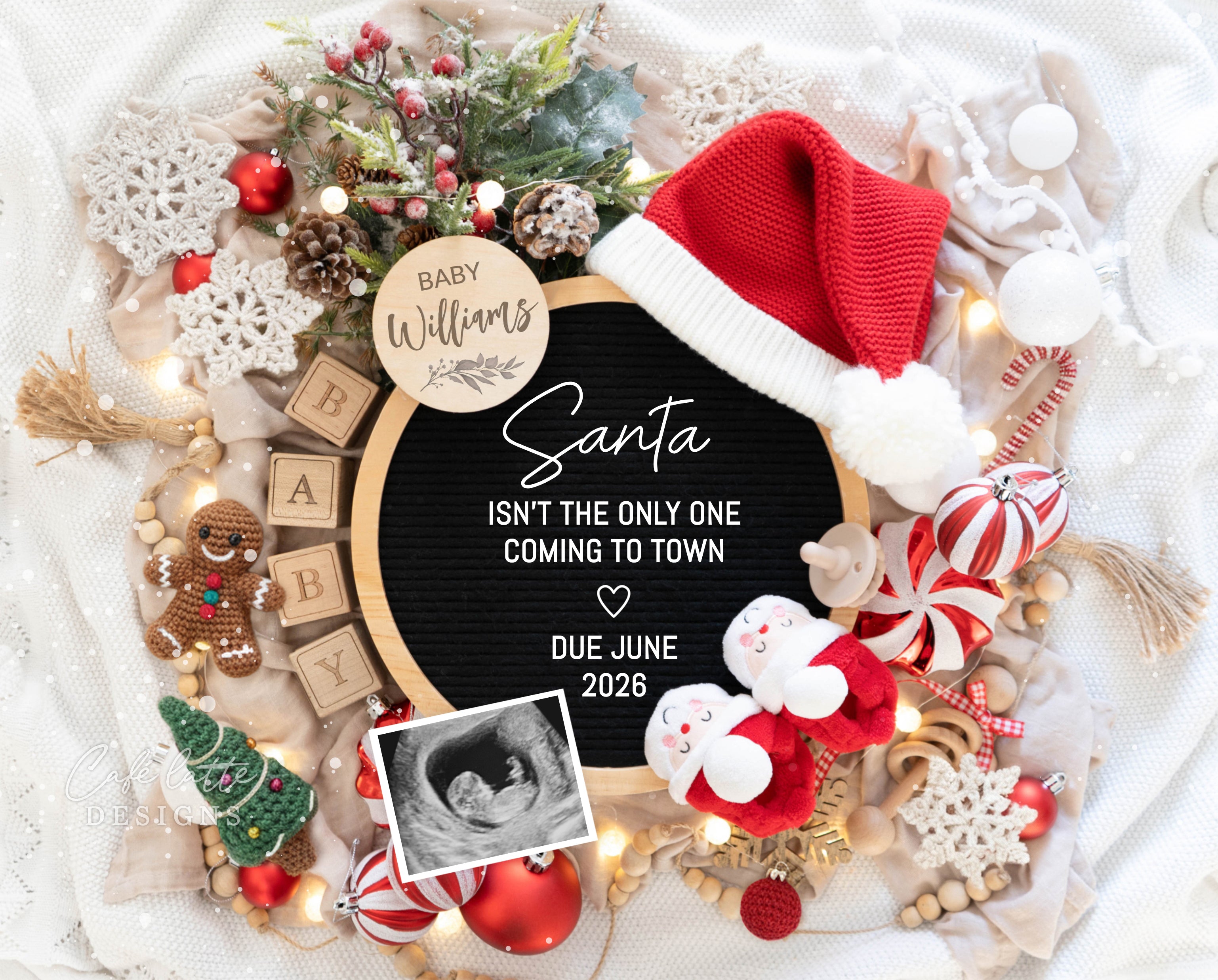 Christmas Pregnancy Announcement - Circle Letterboard, Crochet Ornaments, Santa Hat - Santa