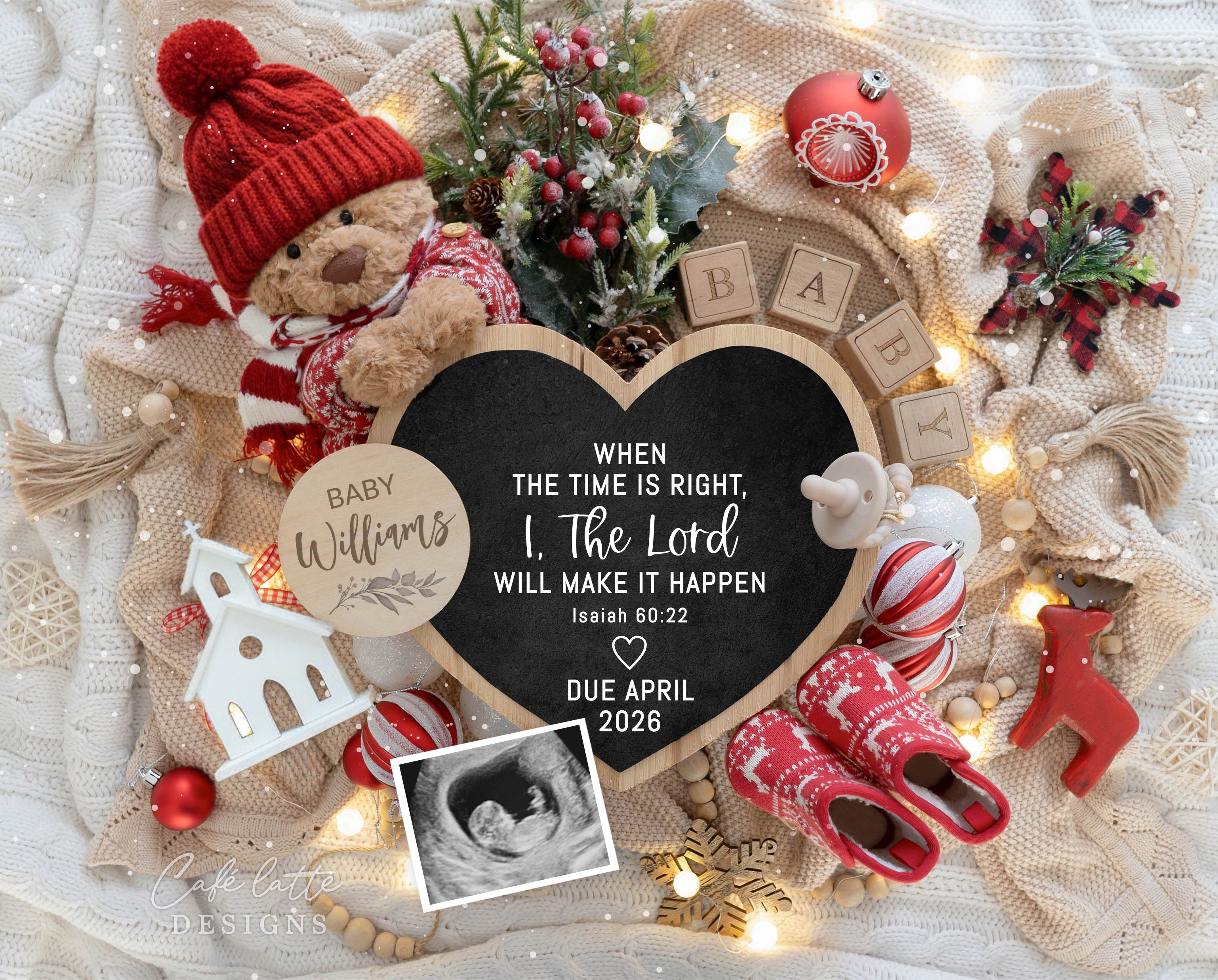 Celebrate your special news this holiday season with this boho-inspired Christmas pregnancy announcement — perfect for social media or to print! Featuring a cozy Christmas scene with a bear wearing a red knit hat and scarf, baby booties, a heart chalkboard, greenery, twinkle lights, and other sweet baby props.