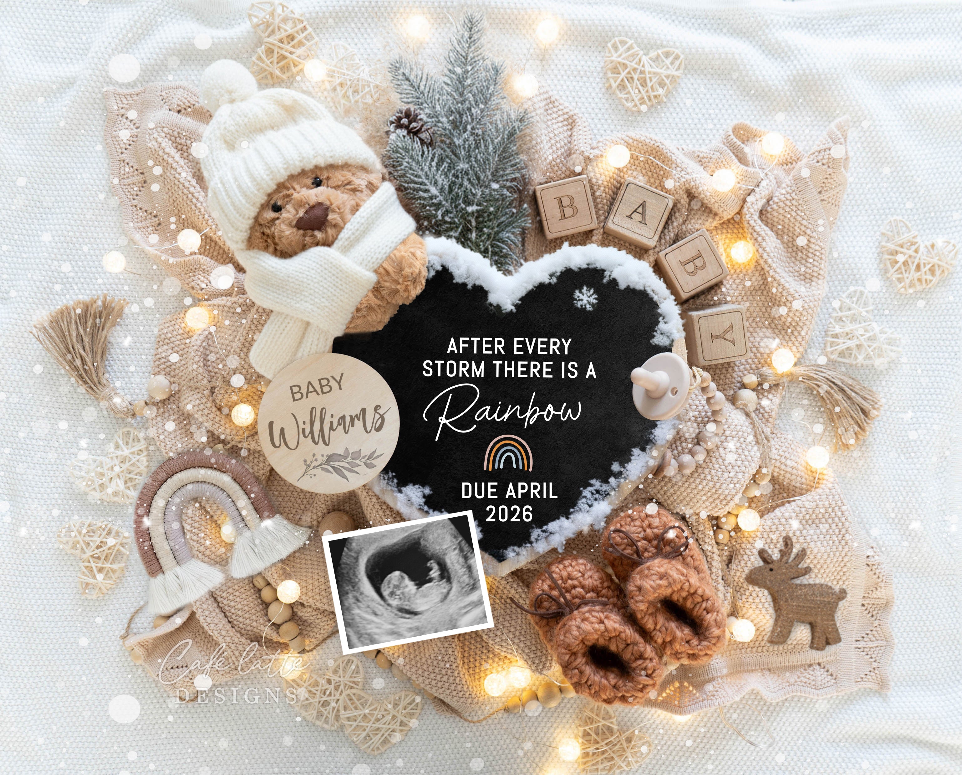 Christmas Rainbow Baby Announcement - Bear with Knitted Hat and Scarf, Heart Chalkboard- Storm