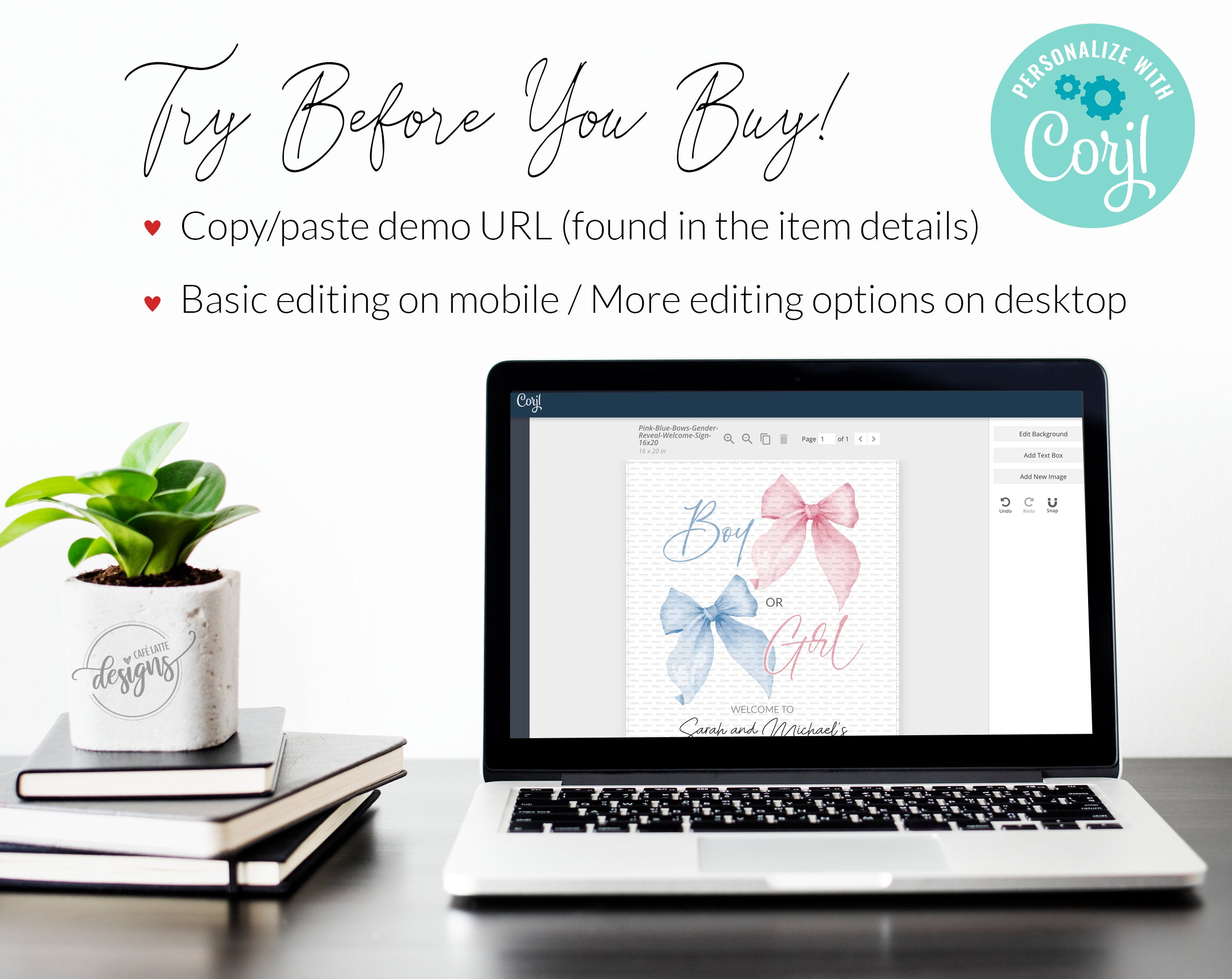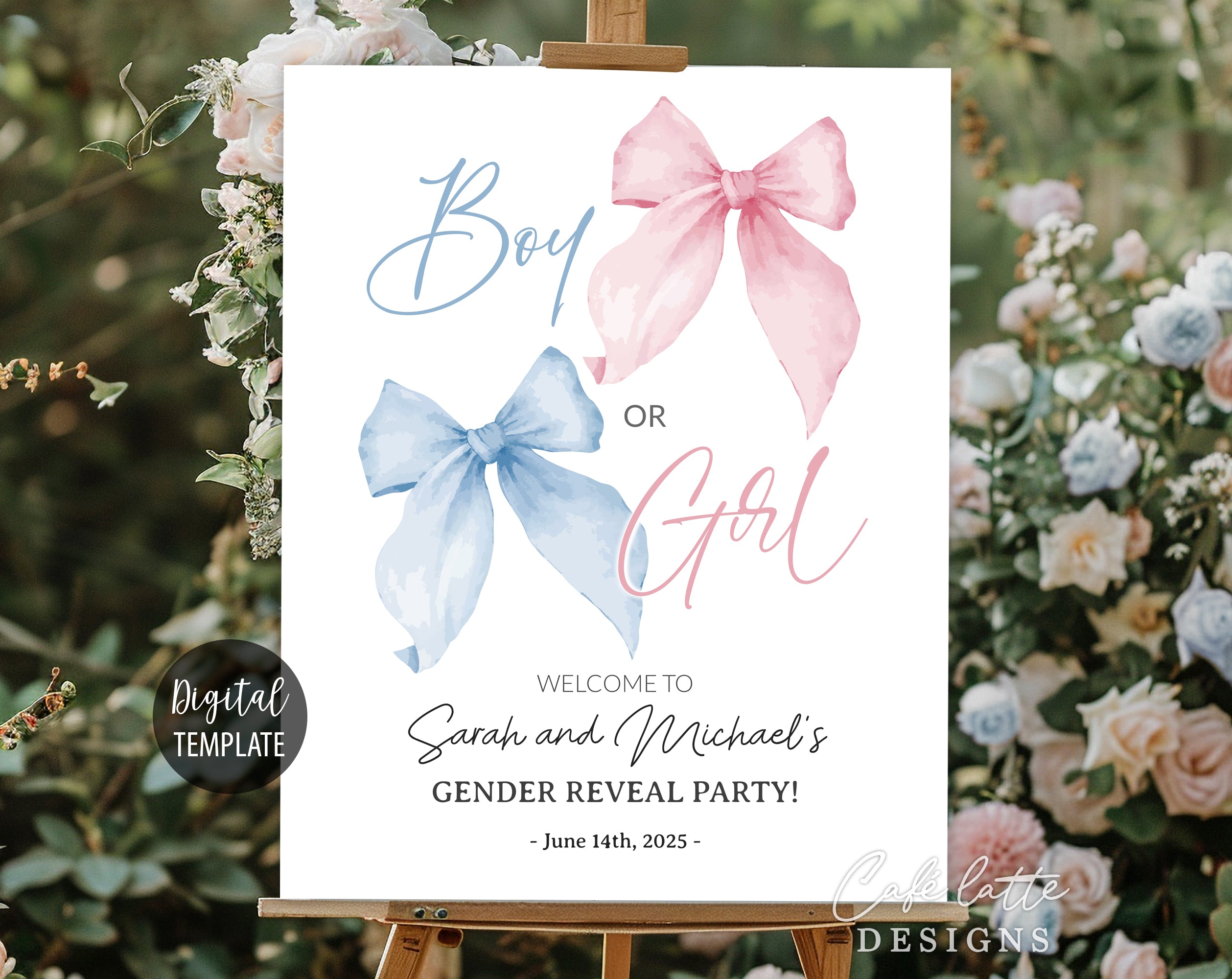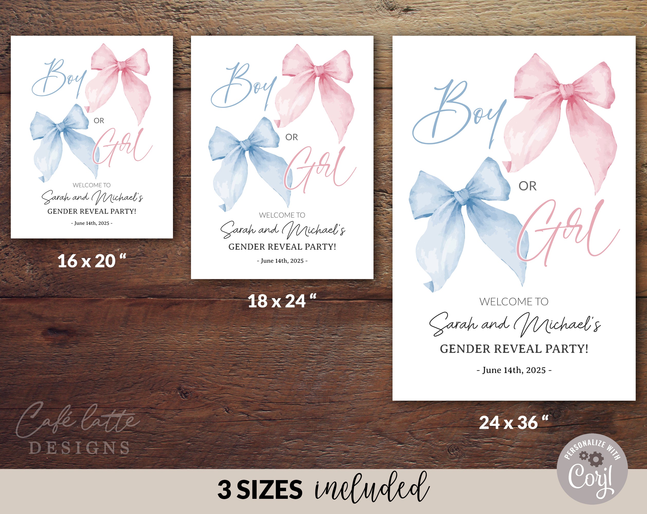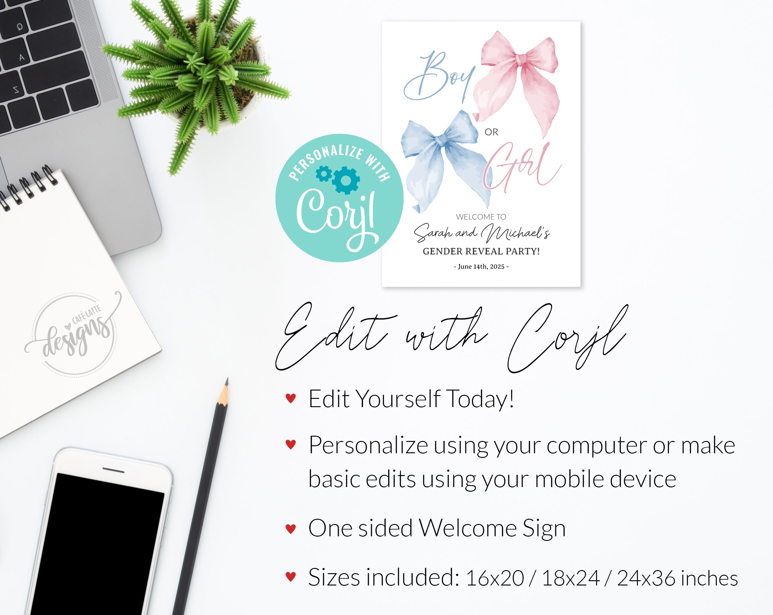 Cute "Boy or Girl" gender reveal celebration welcome sign. Editable welcome sign with pink and blue bows. Personalize this gender reveal welcome sign and print it out at any local print shop. Perfect to welcome family and friends at your gender reveal party! You can edit the text and customize this template using Corjl.