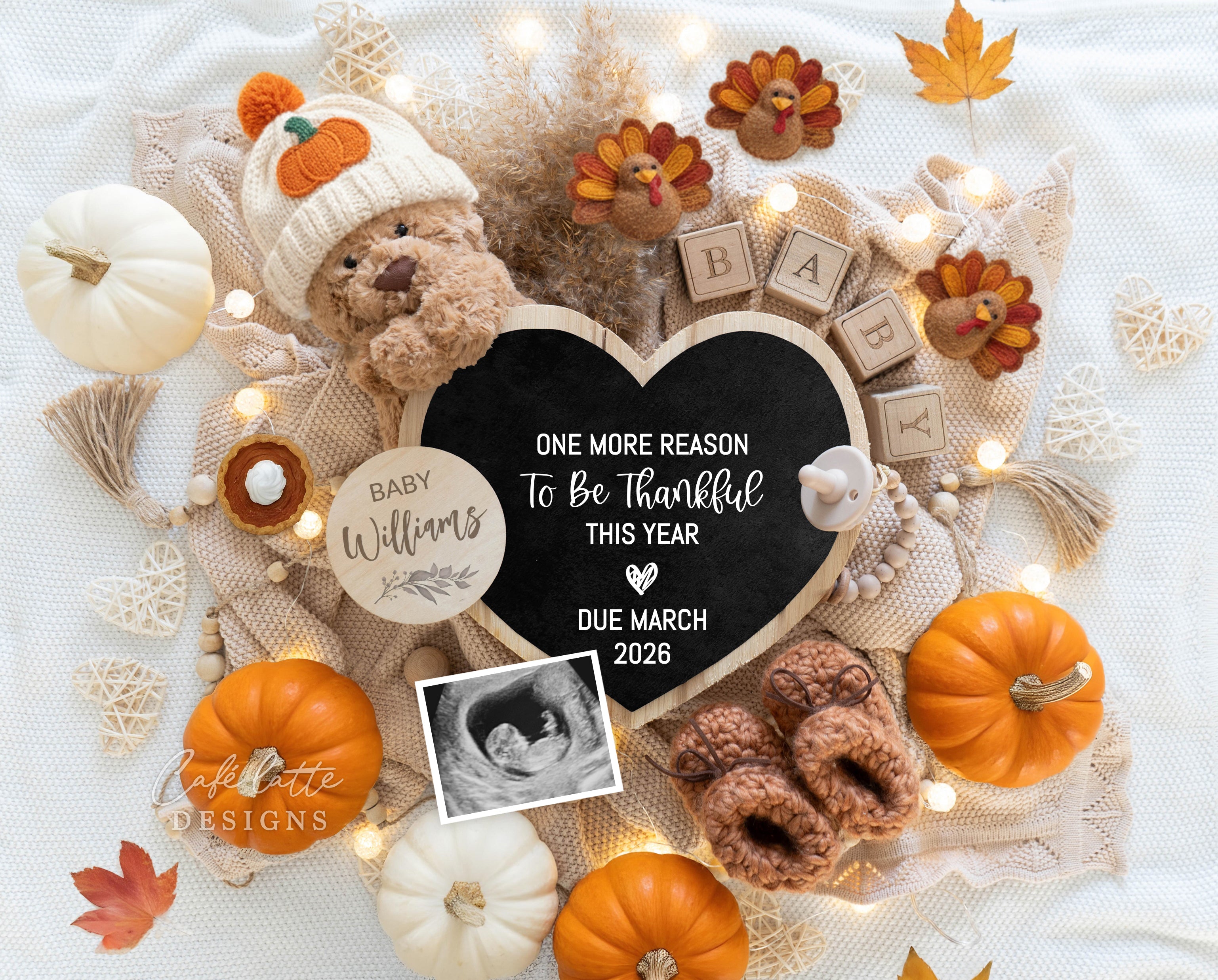 Thanksgiving Pregnancy Announcement - Bear, Pumpkin Hat and Heart Chalkboard - Thankful (Copy)