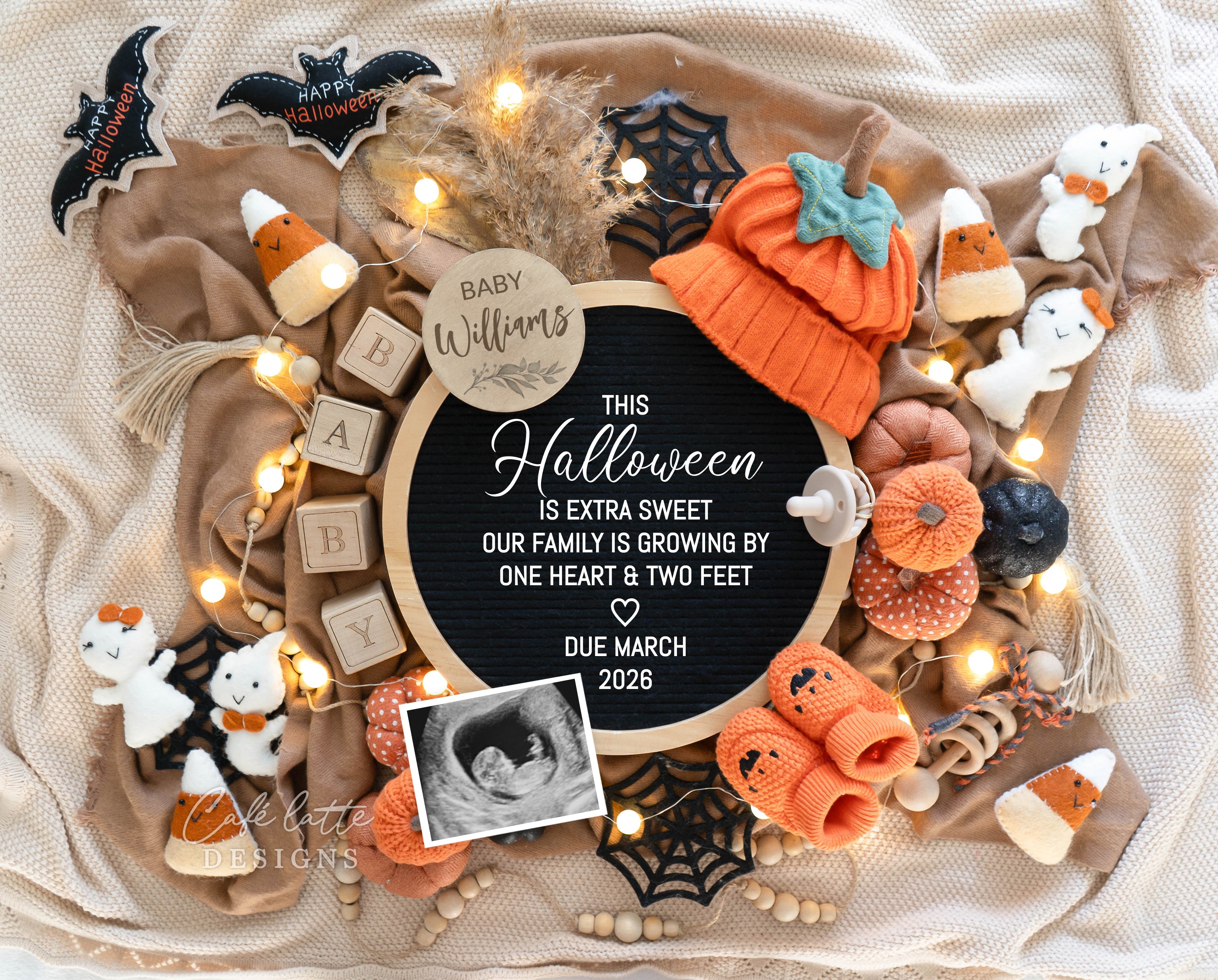Halloween Digital Pregnancy Announcement - Circle Letterboard and Pumpkins - Two Little Feet