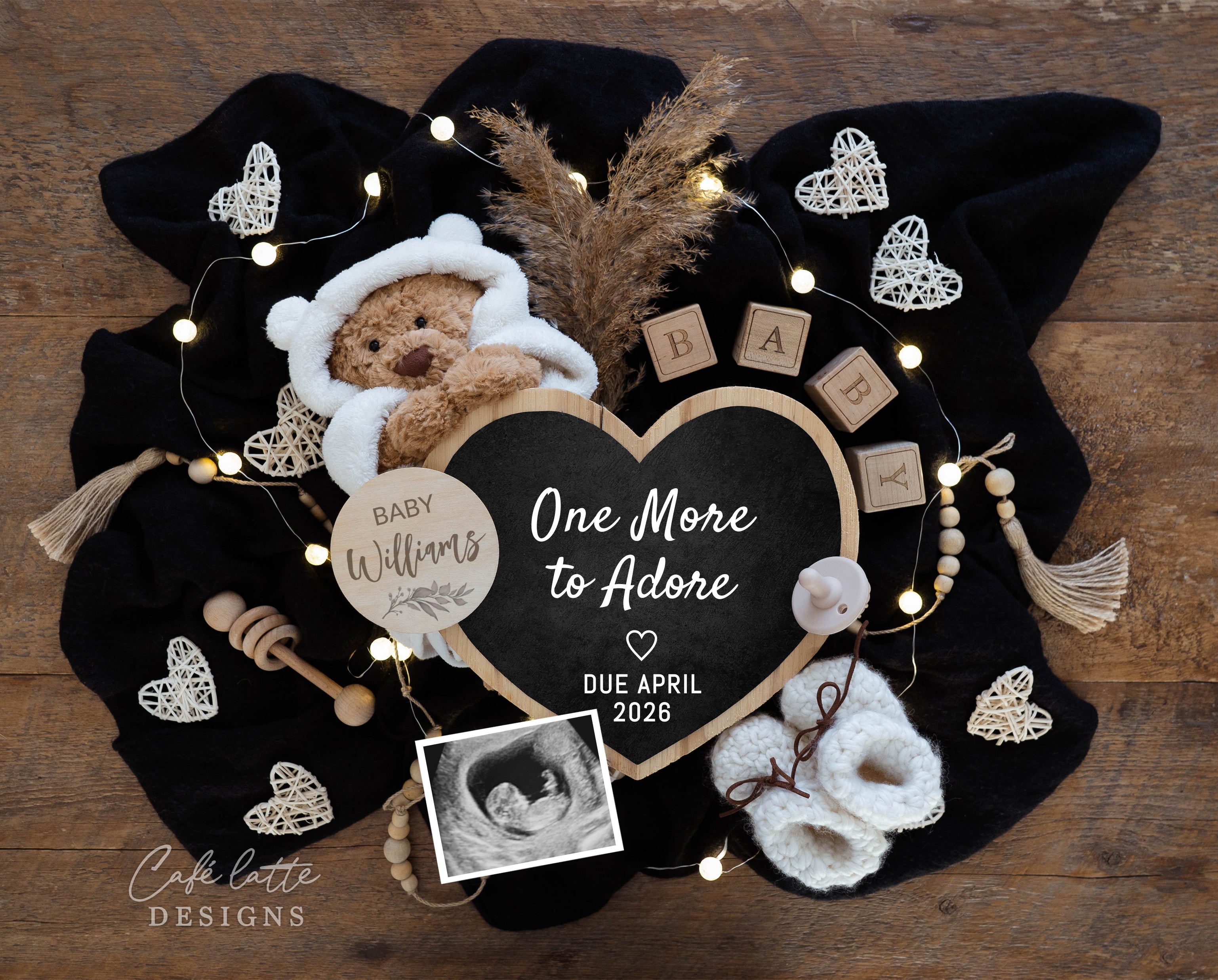 Surprise everyone with your baby announcement digital for social media that is editable and printable. This gender neutral pregnancy reveal photograph has a cute teddy bear, baby props, pampas and a heart chalkboard with the phrase: "One more to adore". The pregnancy announcement template also includes your baby's family name, your due date and a photo of your choice (optional). This is the perfect pregnancy announcement to husband, pregnancy announcement gift and a great way to surprise your parents, grandparents, sister, brother, family members and friends! Personalize this pregnancy announcement digital and send it by email, through social media, text message or print it out. You can edit the text and customize this pregnancy announcement digital template using Corjl.