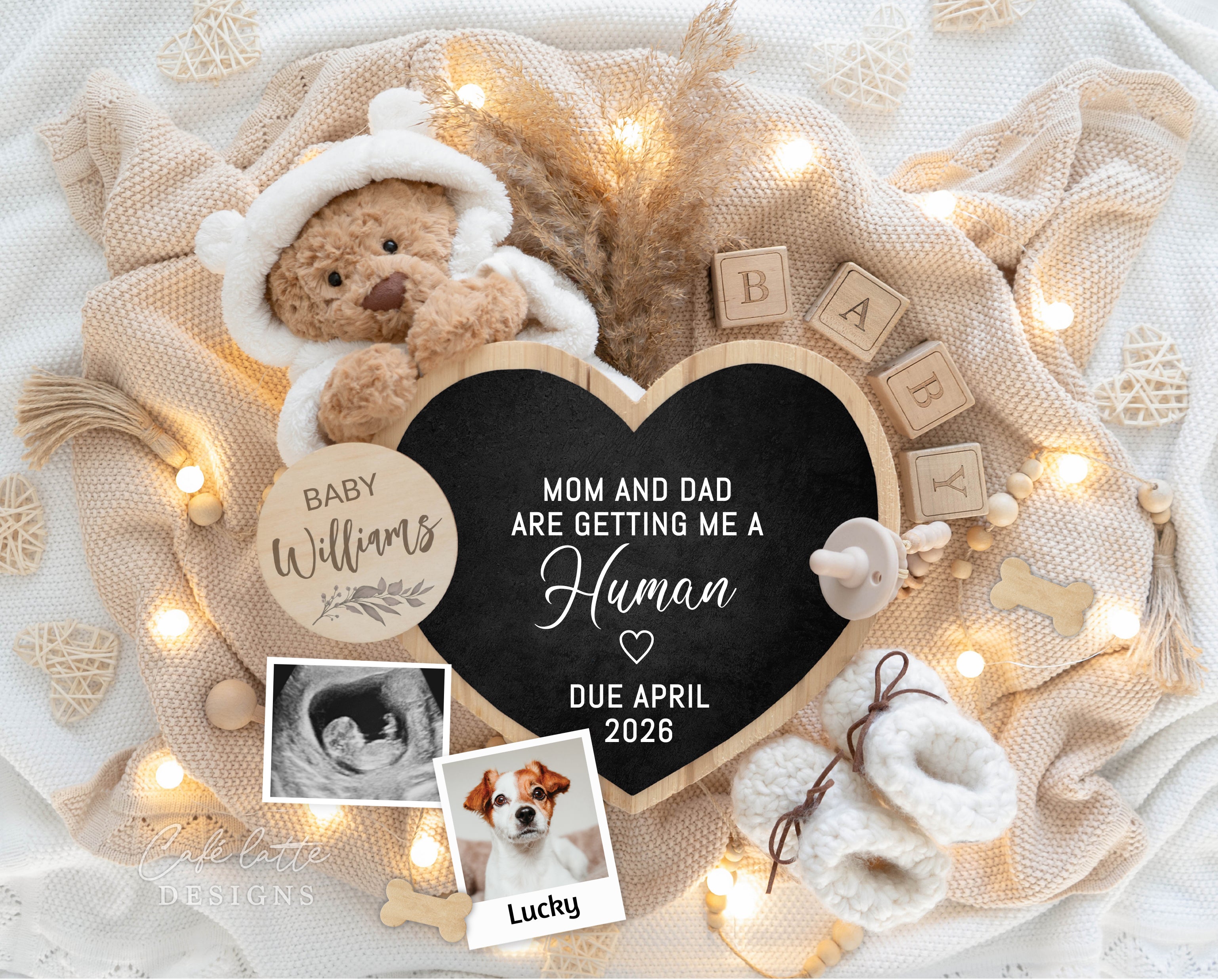 Surprise everyone with your baby announcement digital for social media that is editable and printable. This dog themed gender neutral pregnancy reveal photograph has a cute little bear, baby props, pampas and a heart chalkboard with the phrase: "Mom and dad are getting me a human." The pregnancy announcement template also includes your baby's family name, your due date and photos of your dogs and ultrasound photo (optional). This is the perfect pregnancy announcement to husband, pregnancy announcement gift and a great way to surprise your parents, grandparents, sister, brother, family members and friends! Personalize this pregnancy announcement digital and send it by email, through social media, text message or print it out. You can edit the text and customize this pregnancy announcement digital template using Corjl.