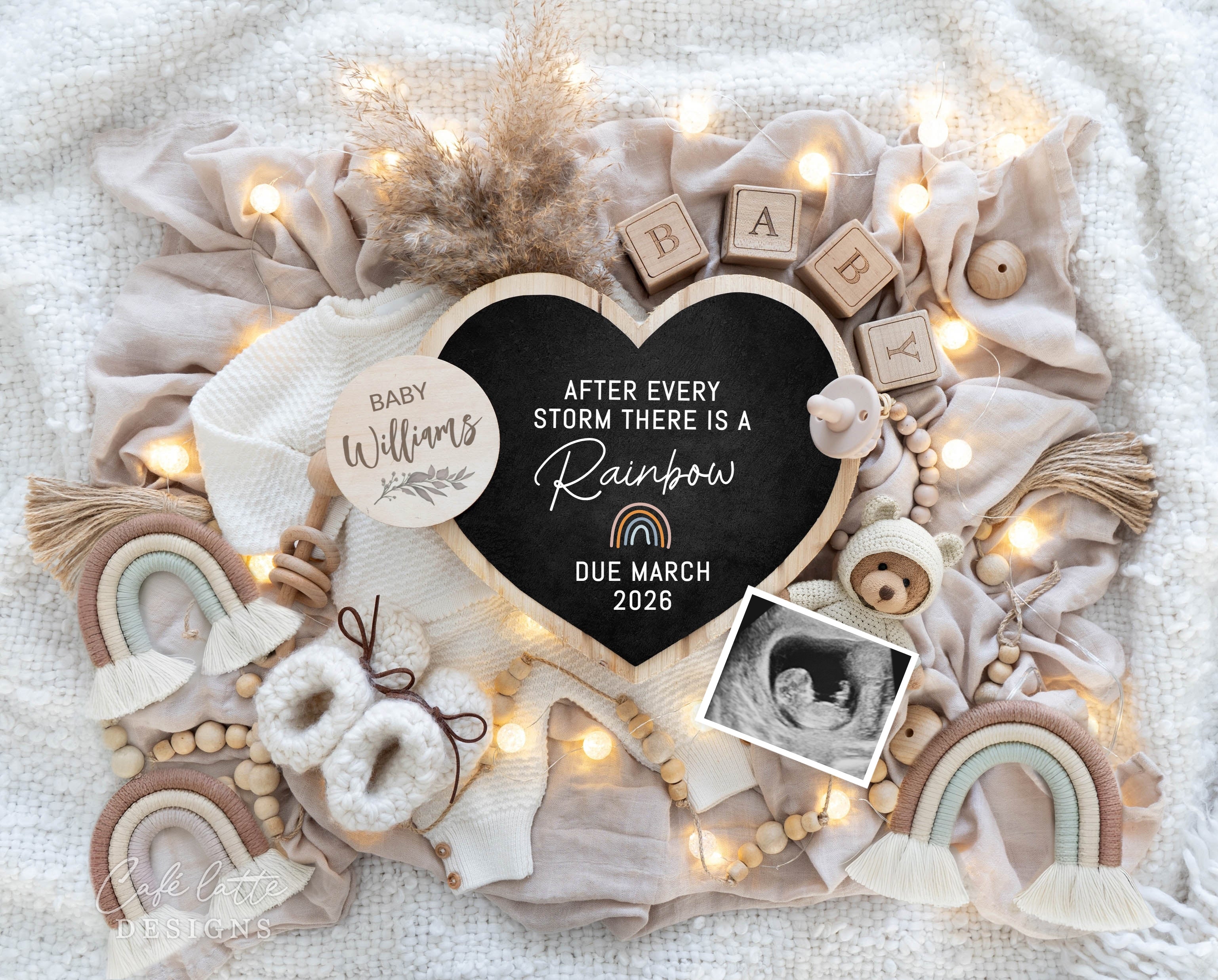 Rainbow Baby Announcement Digital Reveal For Social Media, Gender Neutral Baby Announcement Digital Image with Boho Rainbow, Heart and Chalkboard, After Every Storm There Is A Rainbow, Little teddy bear holding ultrasound