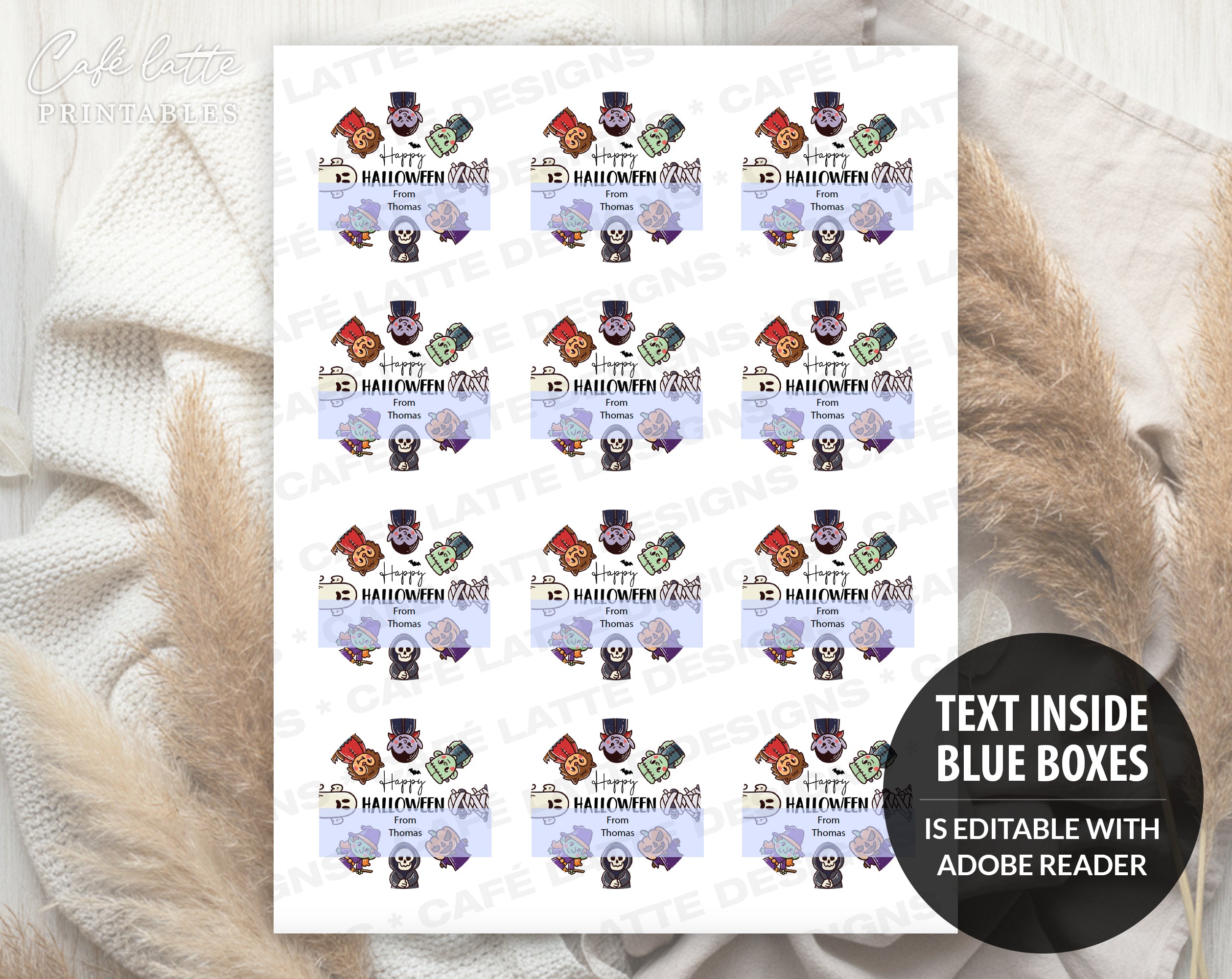 Editable and printable custom Halloween stickers for kids, family, friends and teachers. The Halloween stickers can also be used for business and company candy treat bags. The gift labels have a cute Halloween design with spooky monsters and the wording "Happy Halloween". Great for your Halloween gifts, you simply need to edit the labels in Adobe Acrobat Reader DC (Free) and print the files!